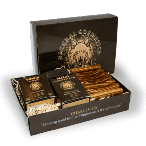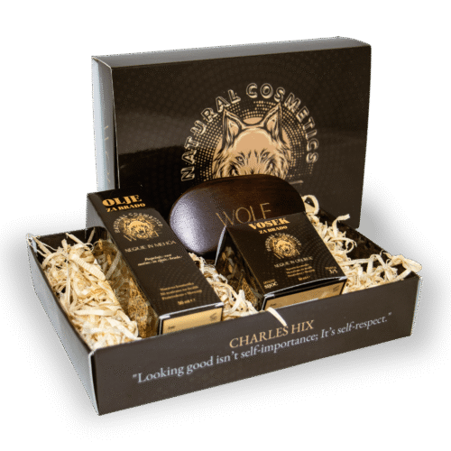 Set združuje tri ključne izdelke Wolf Natural Cosmetics – Naravno milo za obraz in telo, premium krtačo in negovalno olje za brado, ki skupaj ustvarjajo popoln ritual nege.