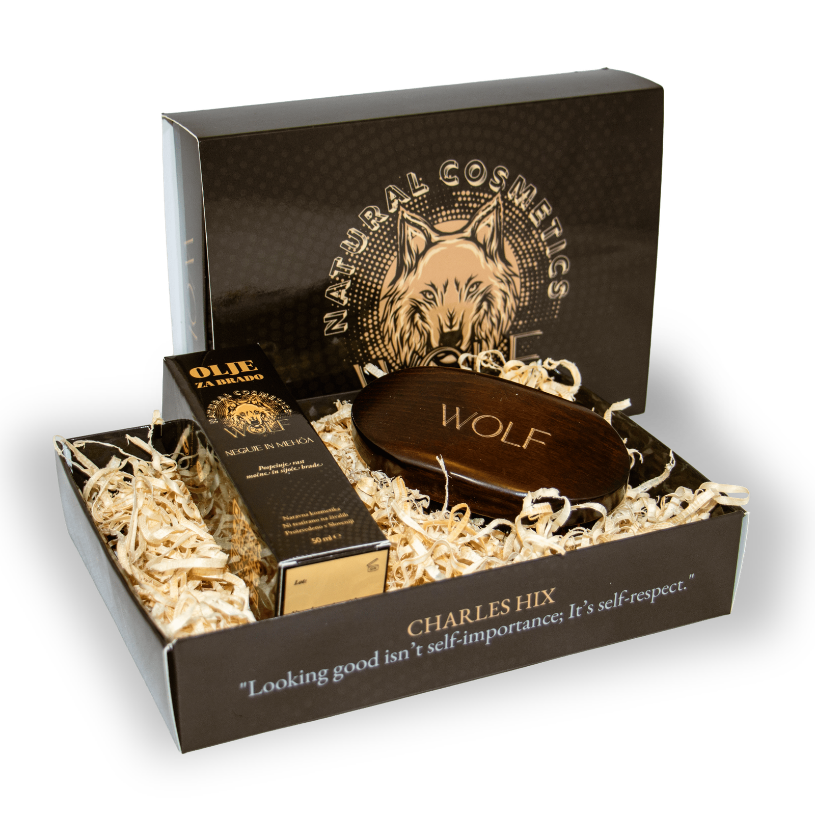Wolf Grooming Duo združuje premium olje za brado in profesionalno krtačo, ustvarjeno za moške, ki želijo urejeno, mehko in negovano brado.